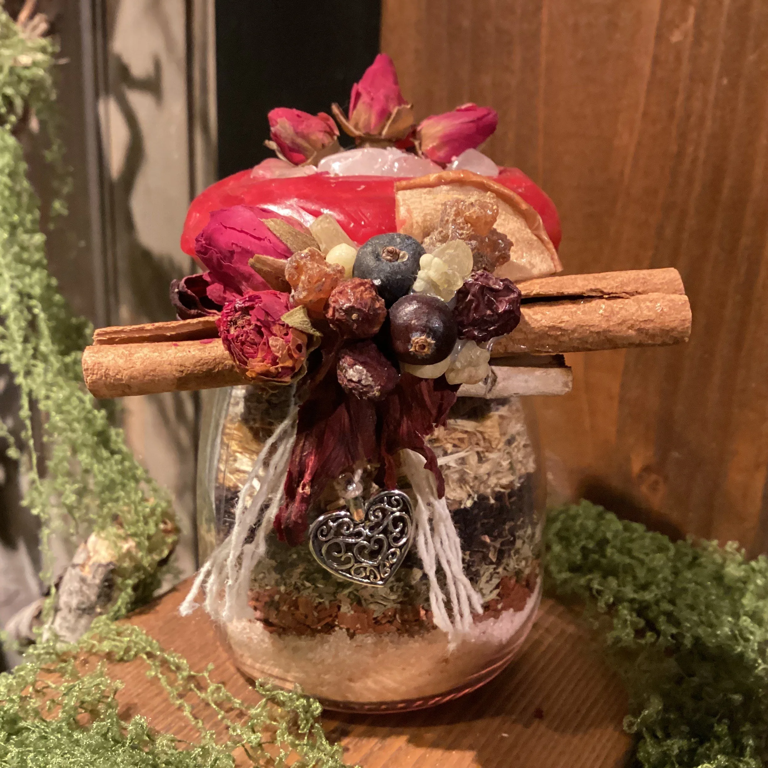 My Love Spell Jars are set with the intention to nurture your spirit, raise your awareness, release your inner beauty and promote mindfulness and purpose in all your love life. The herbs, spices, botanicals & resins are all attuned to romantic love and will act as a focal point to manifest your intentions. Promoting positive vibrations that others will be drawn to. The jar is sealed with red wax imbedded with Rose Quartz crystals, the stone of love and relationships. A heart charm adorns the front. Use with a red candle and place in your bedroom or another intimate area of your home where love can flow freely.